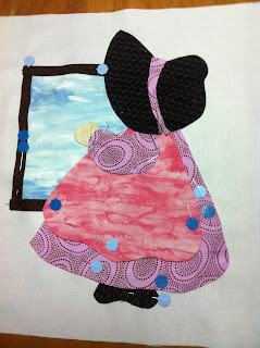 This is the fourth and last Sunbonnet Sue for a quilt that will have the 7 days of the week SBSs in redwork for the main body, and applique SBSs in the 4 corners.Each Sue represents a classic quilt block. This Sue on the left represents Attic Windows. Which is a pattern I have on my Quilty Bucket List.